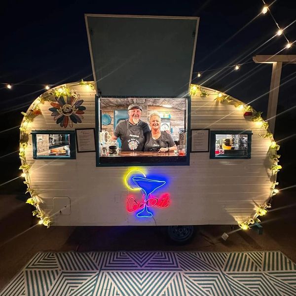The Crazy Daisy is a 1961 Layton vintage camper restored and used to serve as a mobile bartending venue.